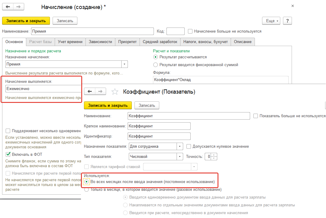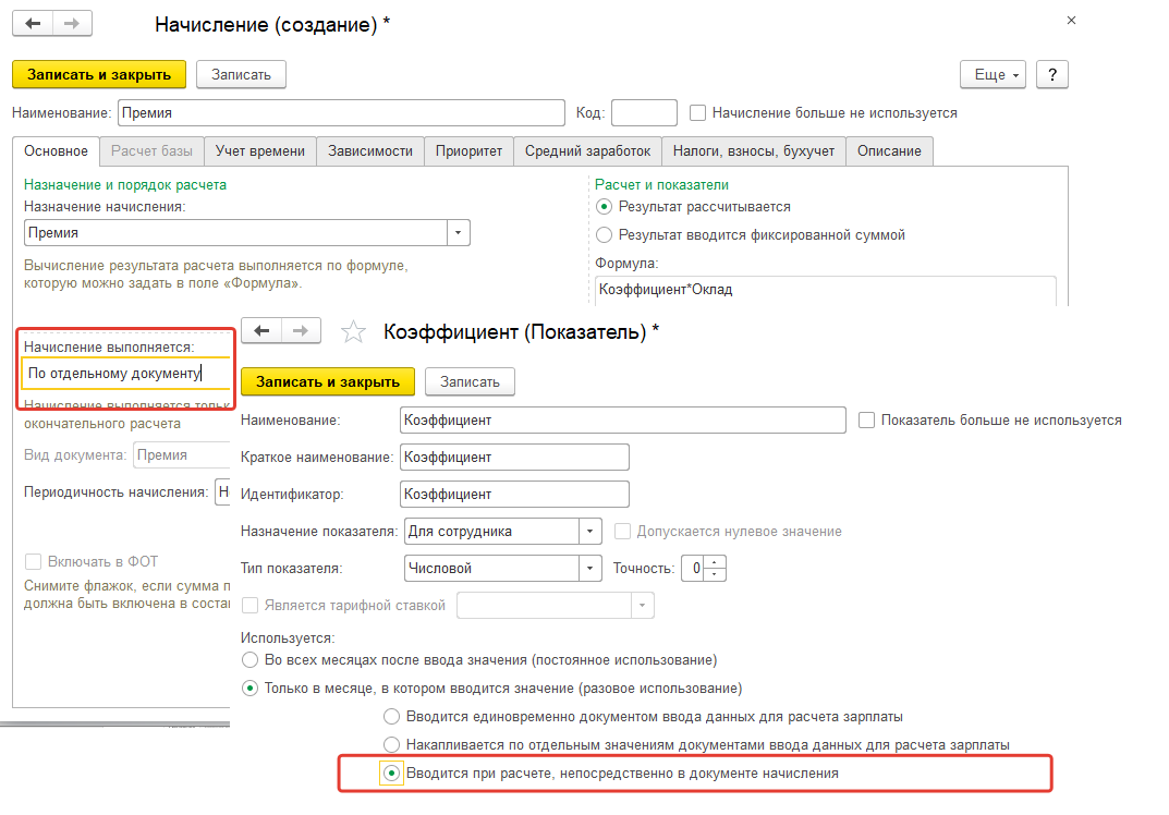 Если коэффициент из месяца в месяц разный (либо вообще отсутствует), либо если премия выплачивается в межрасчетный период, а не вместе с зарплатой, то показатель удобнее настроить как разовый, вводимый в документе начисления. Само начисление будет выполняться по отдельному документу.