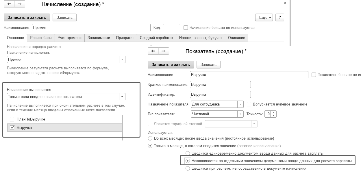 Можно усложнить пример и предположить, что коэффициент – это на самом деле выполнение плана по выручке. Т.е. коэффициент равен выручка/ план по выручке. В этом случае формула расчета может быть настроена полностью: оклад*(выручка/план по выручке). Допустим, принято решение, что: план по выручке устанавливается на месяц, а факт по выручке регистрируется ежедневно. Тогда для ввода показателей по выручке и по плану задействуется документ "Данные для расчета зарплаты" (что и отмечается в использовании), а выполнение начисления выбирается – только если введено значение показателя "Выручка".