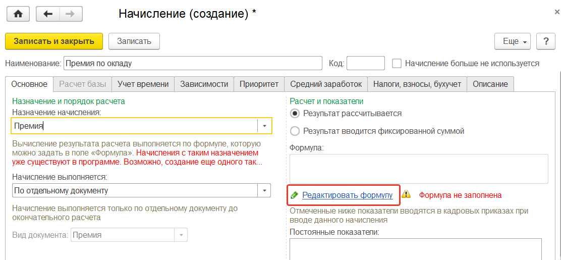 Г) Начисление будет выполняться по отдельному документу (обратите внимание на предупреждение программы – говорится о том, что в программе уже есть разовая премия по отдельному документу, однако она иной формулы, поэтому сообщение в этом примере игнорируем). Остальные настройки оставим пока по умолчанию, запишем и закроем настройки данного начисления.