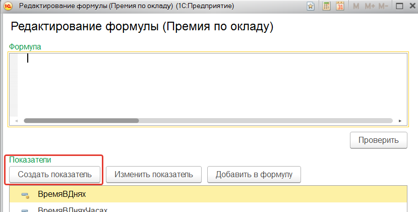 При этом показатель "Оклад" уже есть в типовой поставке, знак умножения достаточно набрать с клавиатуры, и следует ввести дополнительный показатель "Количество окладов для премии", добавим его в список показателей непосредственно из формы редактора формул.