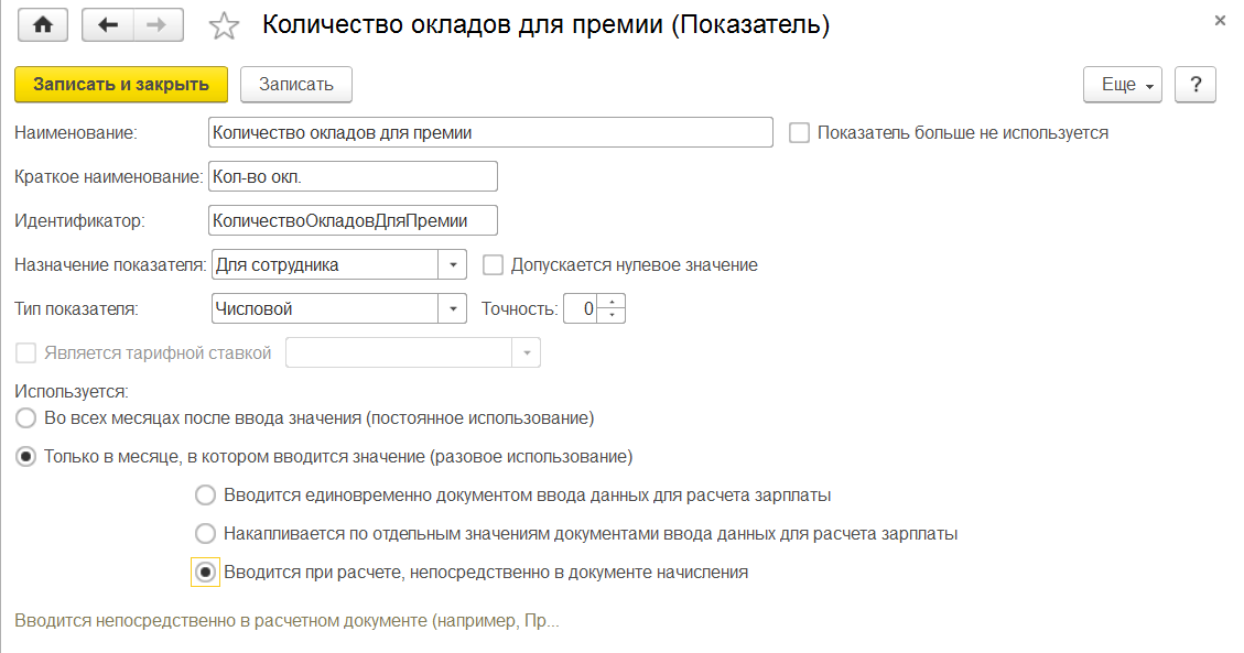 Если же показатель уже назначен, то его можно не запрашивать, а использовать назначенный. Например, для премии по окладу еще раз запрашивать ввод оклада не нужно – он автоматически подставиться по кадровым данным.