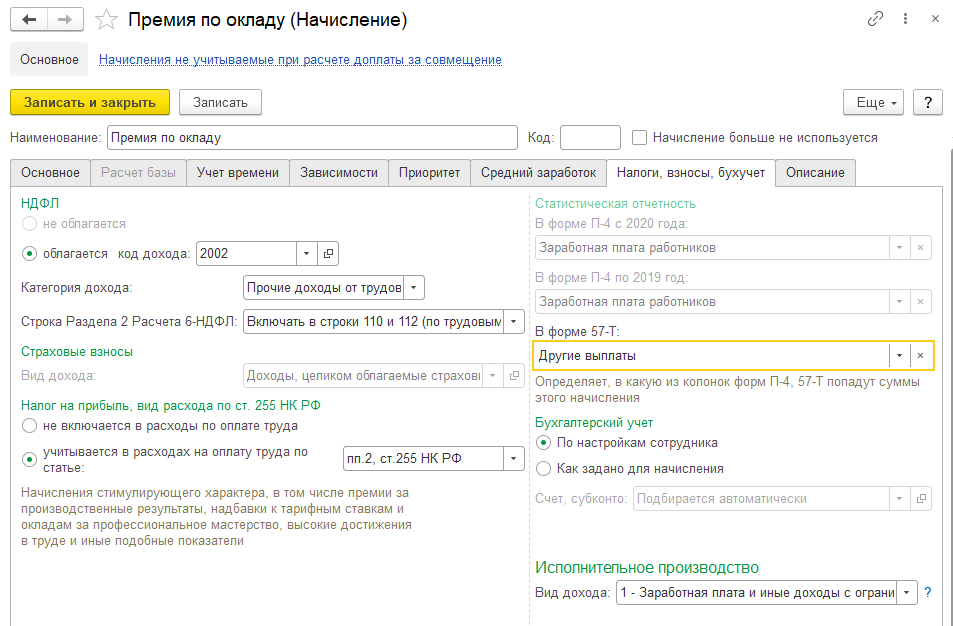 Д) Уточним настройки налогообложения НДФЛ на закладке "Налоги, взносы, бухучет", остальные настройки оставим пока по умолчанию. Запишем и закроем настройки данного начисления.