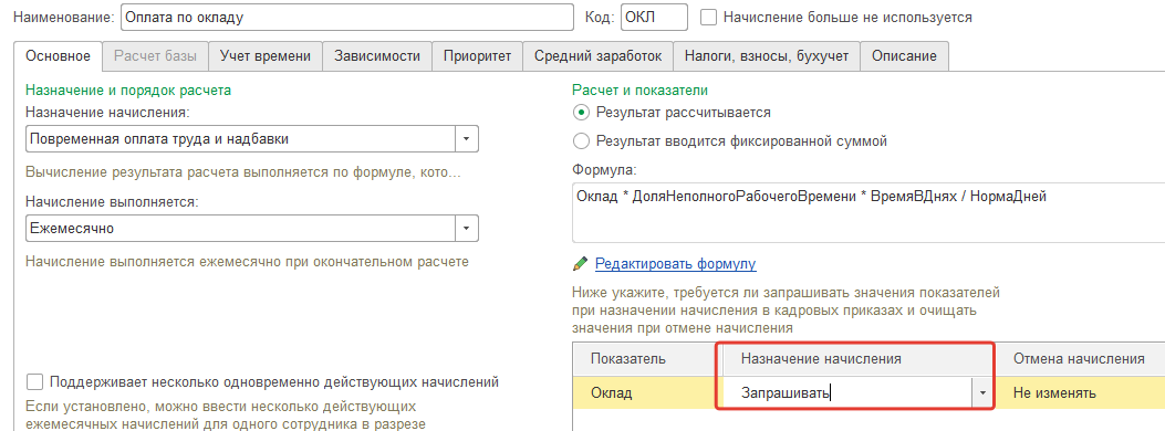 - Для начислений со специализированным назначением используется предопределенная формула расчета, ее пользователь отредактировать не может.