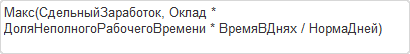 Пример. При установке флажка "Сдельный заработок" в программу было добавлено несколько начислений по сдельному заработку. Обратите внимание на формулу расчета типового начисления "Сдельный заработок (для работающих по окладу)": сравнивается размер сдельного заработка и оплата за фактически отработанное время. Для начисления сотруднику выбирается максимальное значение (функция Макс (,)).
