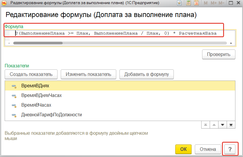 Формула вида расчета состоит из показателей и действий/функций. При этом показатели выбираются из справочника "Показатели расчета зарплаты", а математические действия набираются с клавиатуры вручную (как при конфигурировании).