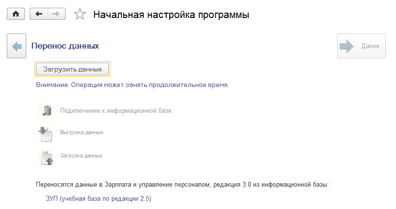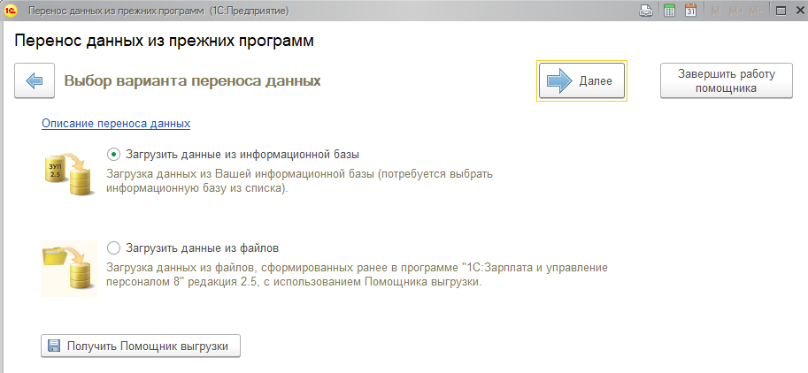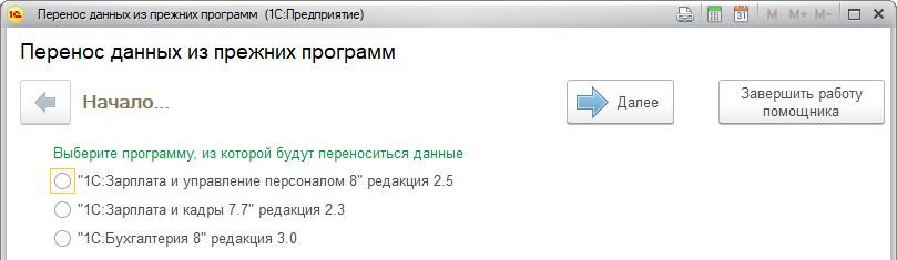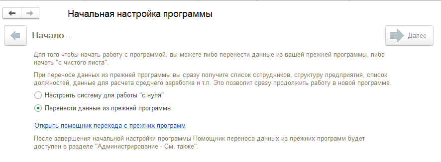 На первом шаге работы помощника начальной настройки существует возможность выполнить перенос данных из программ "Зарплата и кадры 7.7", редакция 2.3, "Зарплата и Управление Персоналом 8", редакция 2.5, либо из конфигурации "Бухгалтерия Предприятия", ред.3.1. Перенос данных непосредственно в приложение возможен только при работе в "тонком клиенте".