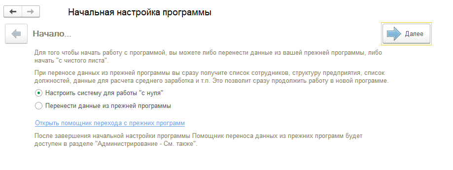 1. На первом этапе работы Помощника начальной настройки предлагается выполнить перенос данных либо настроить систему "с нуля".