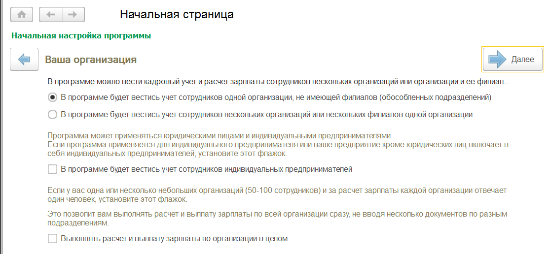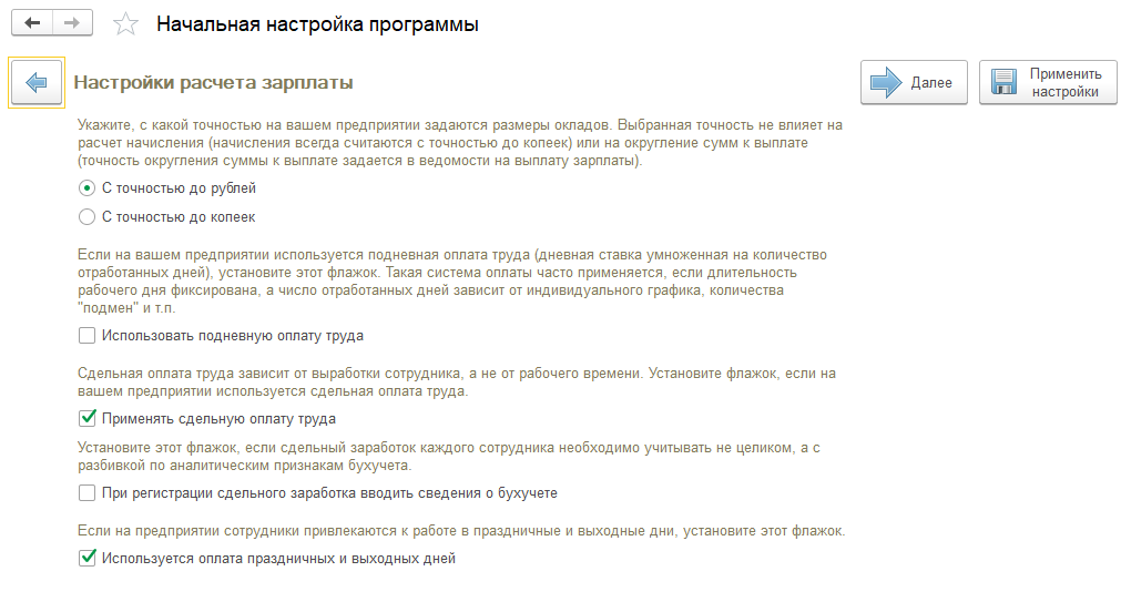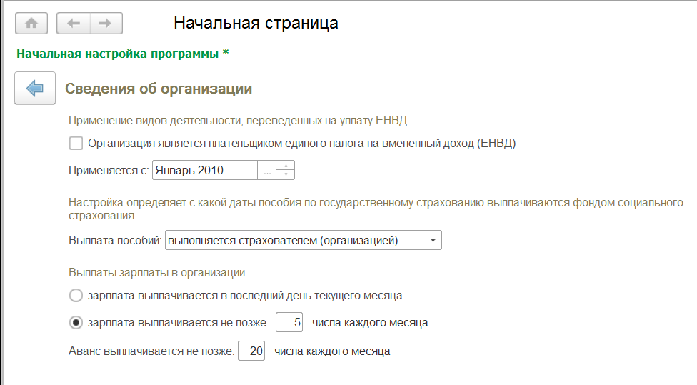 5. Позволяет уточнить настройки организации и настройку расчета зарплаты