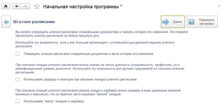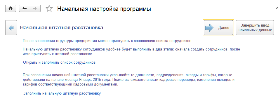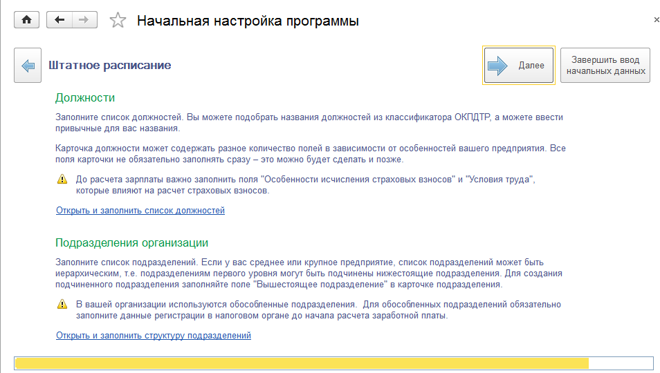 Далее предлагается ввести список подразделений и должностей и составить штатное расписание, если оно ведется.