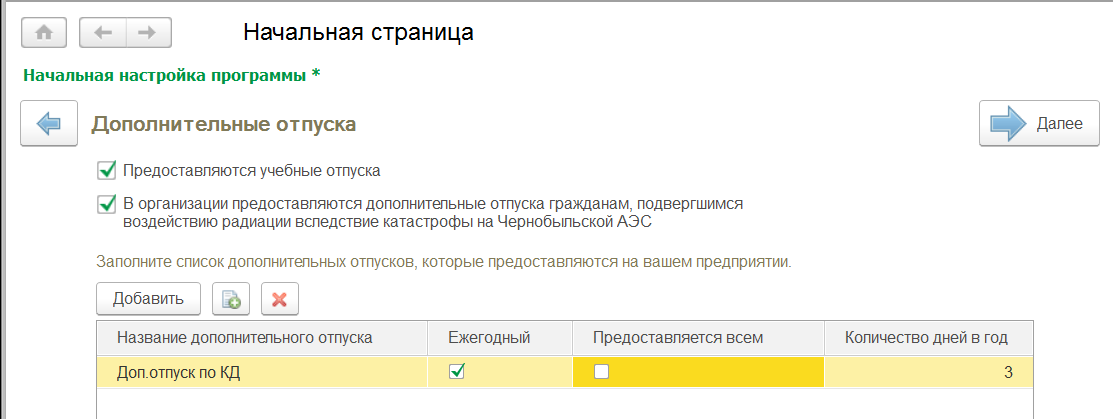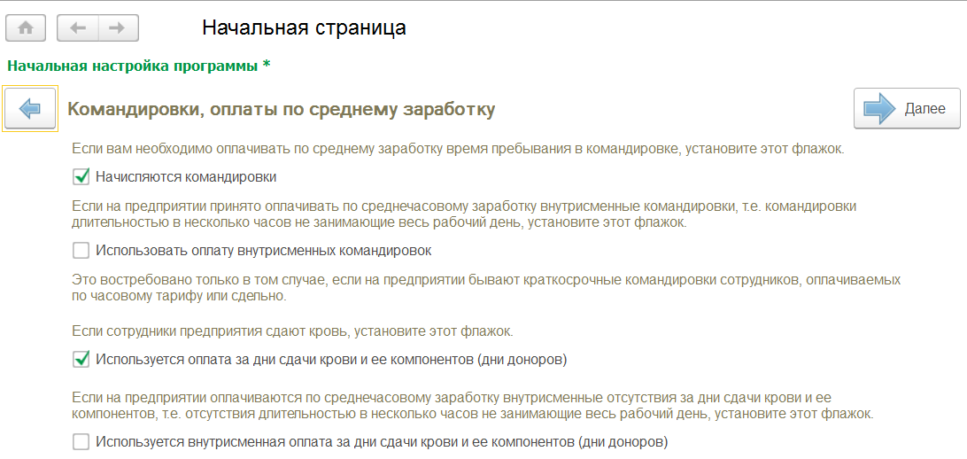 14. Настройка командировок. Соответствует настройке из раздела "Настройка / Расчет зарплаты / Настройка состава начислений и удержаний / Отпуска". Дни доноров добавляются в список начислений.