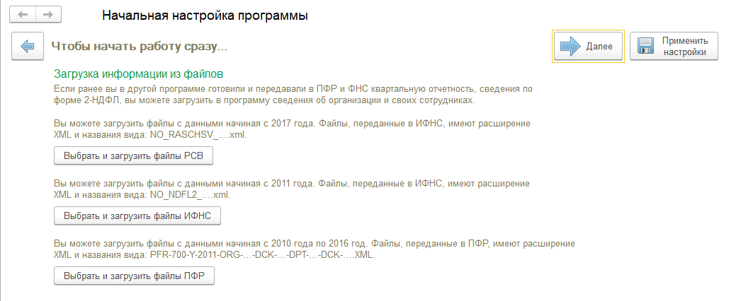 Обеспечивается возможность загрузить отчетность, которая была сдана за прошлые периоды, в настраиваемую информационную базу. Это позволит, если данные не переносятся из другой программы, то с помощью данной загрузки можно заполнить справочник "Физические лица". Нажав команду "Выбрать и загрузить…", следует указать путь к соответствующим файлам отчетности в ПФР и ИФНС.