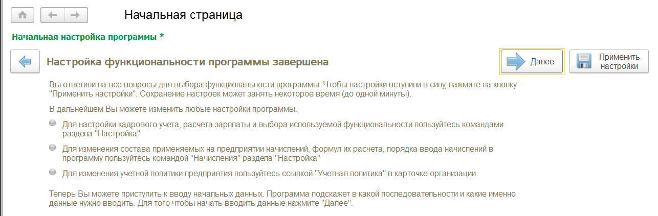 После чего предлагается завершить первый расчет зарплаты и перейти к работе непосредственно в программе.