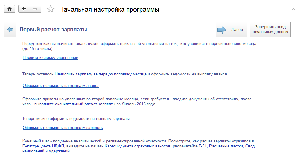 Далее в помощнике предлагается завершить расчет зарплаты за первый месяц: