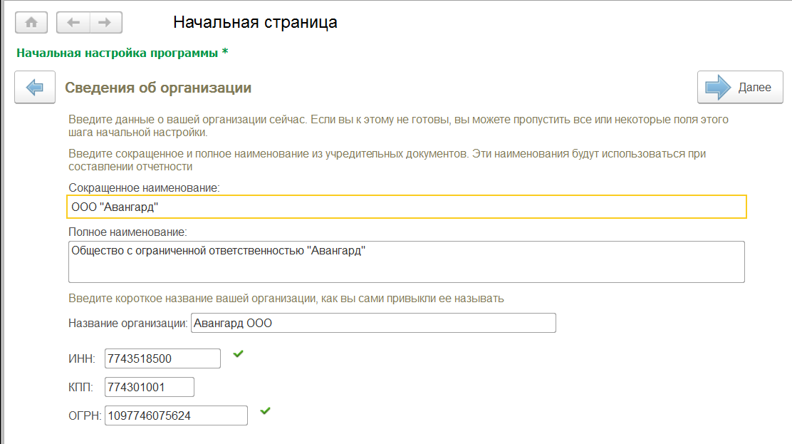 Если стартовый помощник не закрывать, то с его помощью можно приступить ко вводу данных. Тогда стартовый помощник предложит пошагово заполнить данные по начальным остаткам и выполнить расчет за первый месяц. Такой вариант подойдет для некрупной организации, и в рамках данного курса использоваться не будет.