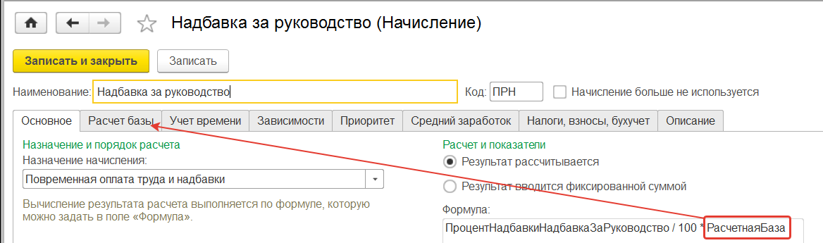 Формула расчета: % за руководство / 100 * Расчетная база (в которую и входят оклад, сделка и пр.). Показатель "Расчетная база" – типовой, и потребует заполнения закладки "Расчет базы", показатель "Процент за руководство" необходимо будет добавить самостоятельно.