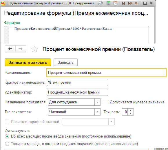 Данный показатель будет постоянным, т.к. премию планируется назначать кадровыми приказами (процент рассчитывается от базы текущего месяца и удобнее производить расчет в том же документе, где рассчитывается оклад и другие базовые начисления). После сохранения формулы расчета процент премии будет запрашиваться в кадровых приказах.