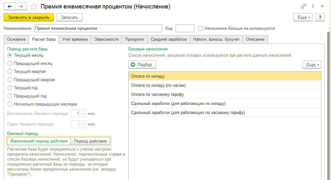 - Предыдущий месяц – месяц, предшествующий периоду начисления (например, для ежемесячной премии процентом от фактически начисленного оклада прошлого месяца).