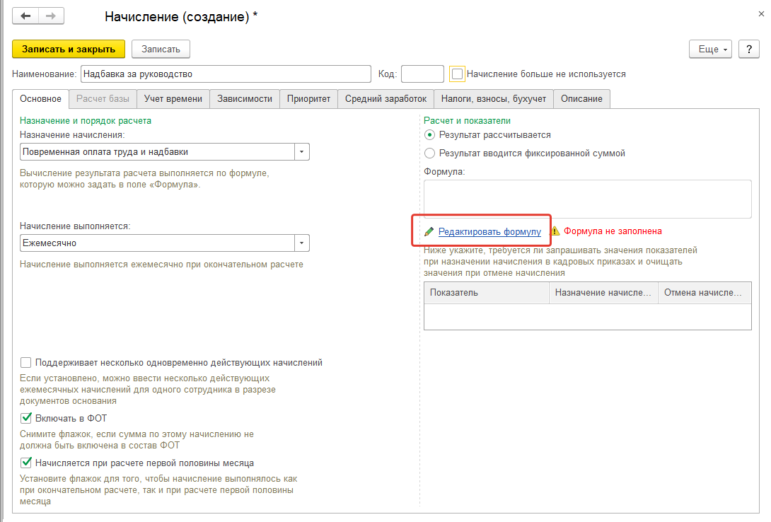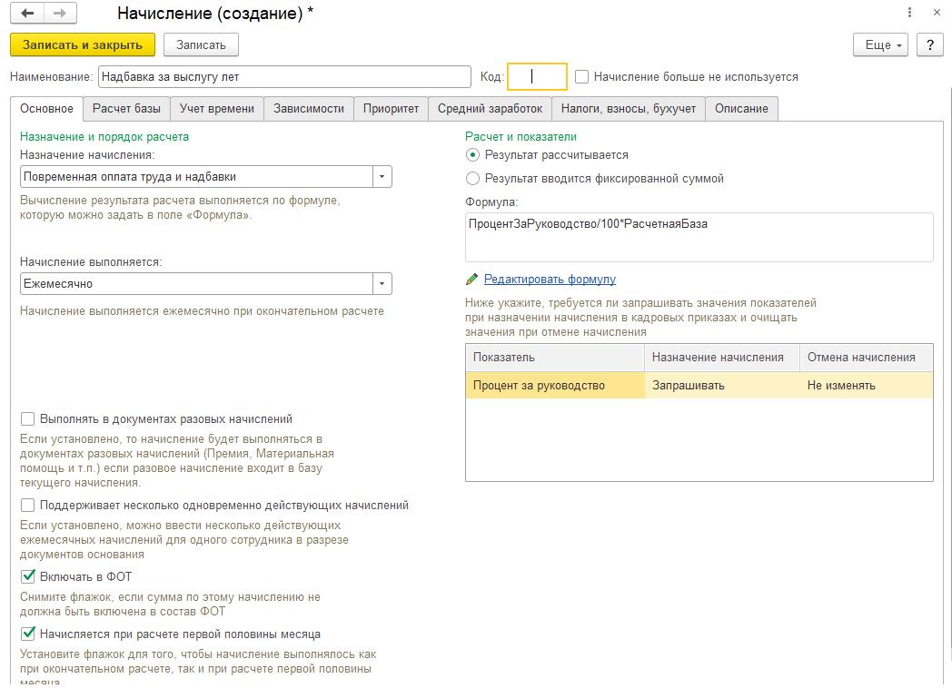 Ж) Остальные настройки оставим пока по умолчанию, запишем и закроем настройки данного начисления.