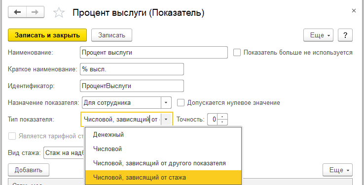 Данный показатель будет иметь тип – числовой, зависящий от стажа, ниже выберем стаж на надбавку за выслугу лет из справочника "Виды стажа".