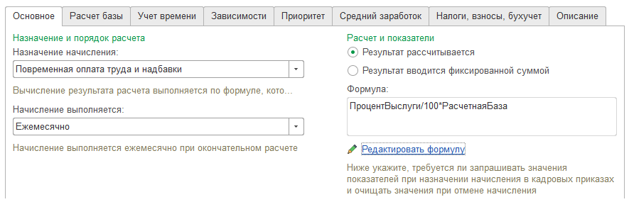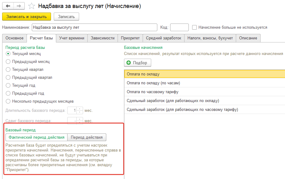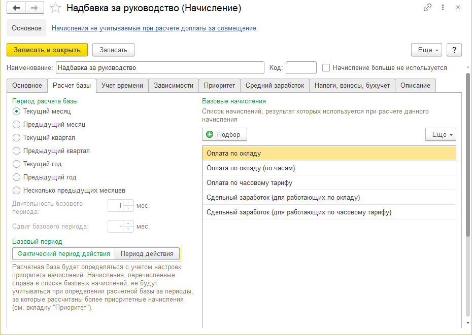 Однако в сложных случаях, когда в формуле начисления присутствуют и показатели расчетной базы, и показатели времени, может потребоваться выбрать в качестве периода расчета – период действия (например, если настраивается доплата до МРОТ за фактически отработанное время, и в базу входит начисление фиксированной суммой; чтобы оно вошло полностью, независимо от отработанного времени, меняется данная настройка).