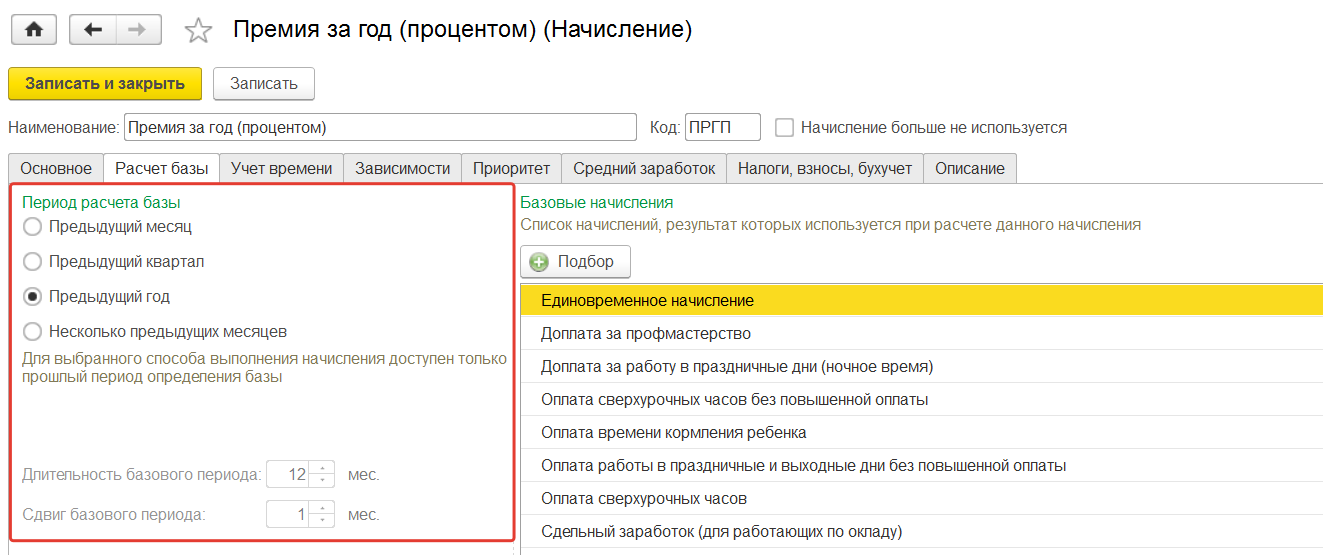 Сдвиг базового периода указывается, если при расчете начисления не используются данные текущего месяца. Например, для премии за прошлый квартал процентом указывается длительность 3 месяца и сдвиг базового периода – 1 месяц.