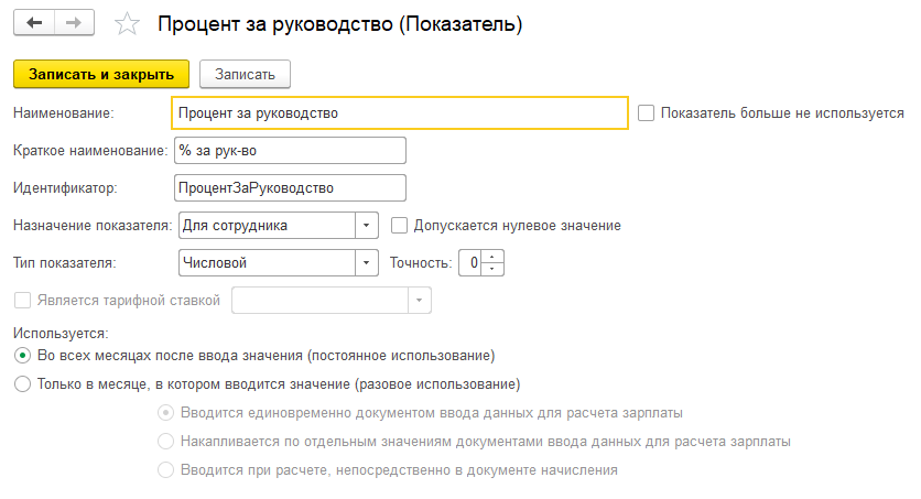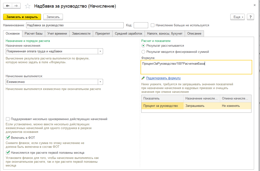 В) Для того, чтобы рассчитать это начисление нам потребуется дополнительный показатель "Процент за руководство", добавим его в список показателей и укажем следующие настройки: