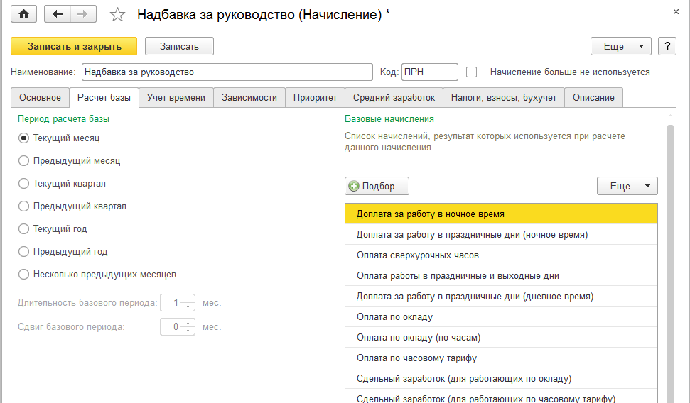 - Текущий месяц – период действия начисления (текущий месяц расчета, обычно используется для ежемесячных надбавок). Недоступен, если начисление выполняется по отдельному документу.