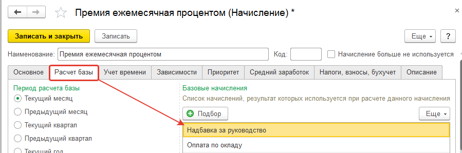 Пример. Нами была добавлена надбавка за руководство. В свою очередь, эта надбавка может входить в расчет базы других начислений и удержаний – см. закладку "Зависимости".