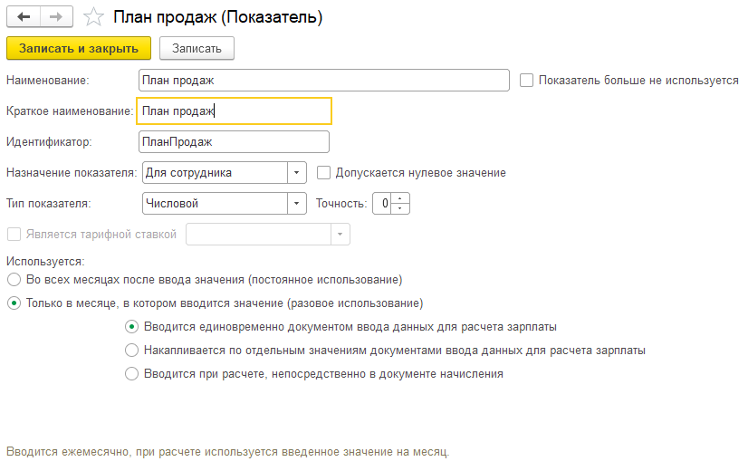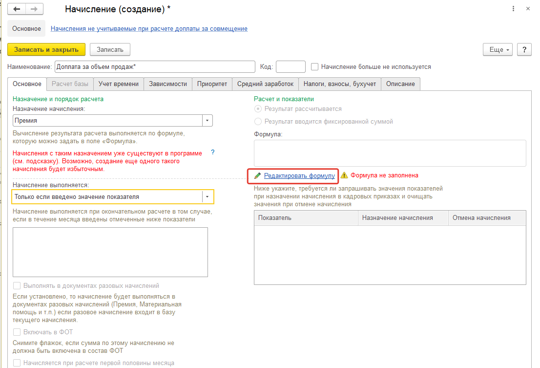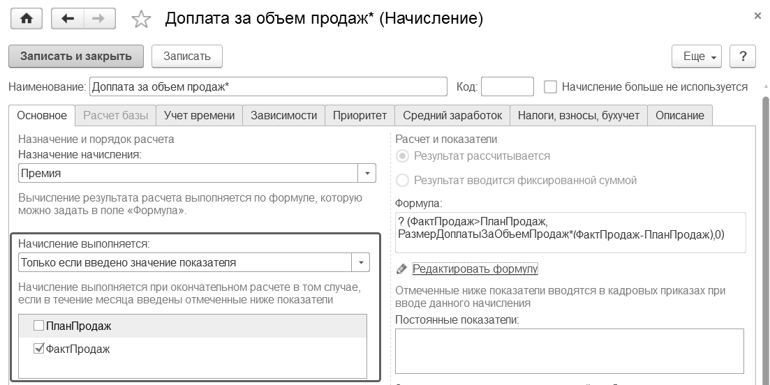 Г) Начисление будет выполняться только в том случае, если в этом месяце у сотрудника будет факт продаж. Укажем факт продаж в качестве определяющего показателя. Остальные настройки оставим пока по умолчанию, запишем и закроем начисление.