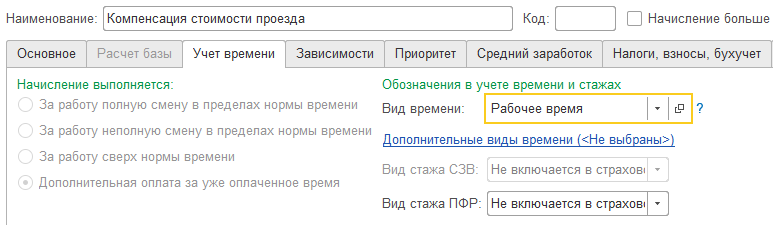 Также необходимо настроить приоритет – перечень начислений, в период действия которых не должна начисляться оплата проезда (это больничные, отпуска, командировки и другие отсутствия – аналогично компенсации питания).
