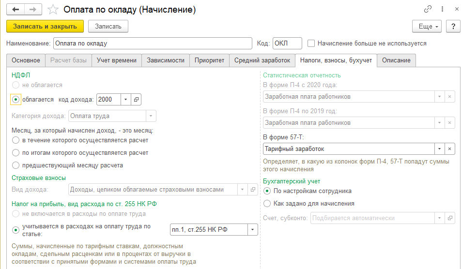 Для каждого начисления на закладке "Налоги, взносы, бухучет" указывается: