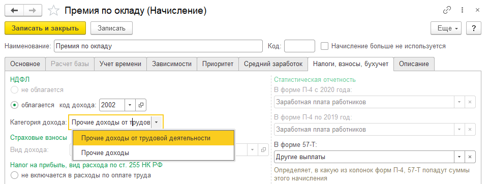 На этой же закладке настраивается, включаются ли начисленные по данному виду расчета суммы в статистическую отчетность: