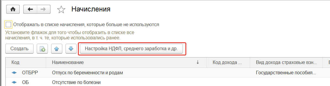 Для этой цели в форме списка начислений используется команда "Настройка НДФЛ, среднего заработка и др.". В открывшемся окне отображаются списки начислений и настройки, которые можно поменять.