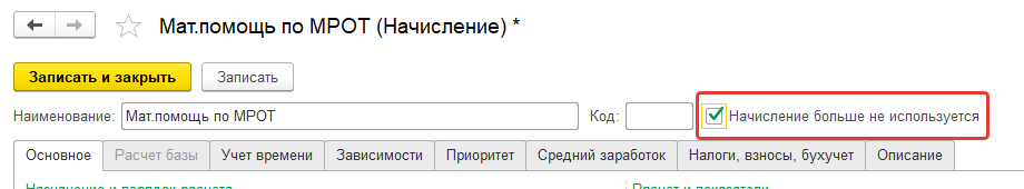При переносе данных либо в процессе работы может появиться необходимость отказаться от использования какого-либо начисления. Для того, чтобы такое "устаревшее" начисление больше не отображалось в списках, в настройке начисления устанавливается флаг "Начисление больше не используется".