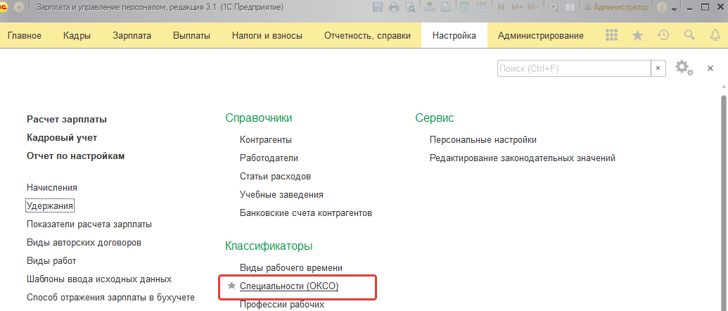 Кадровые справочники – классификаторы вызываются из раздела "Настройка". При этом данные справочники можно разделить на три группы: