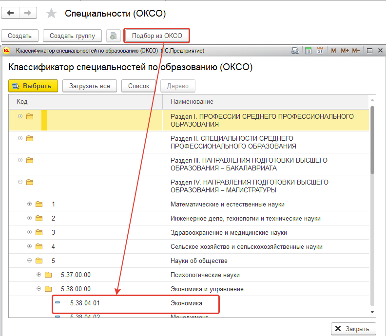 Выберем специальность "Экономика" двумя кликами левой клавиши мыши - она будет добавлена в справочник программы (также можно загрузить все специальности по соответствующей команде). После чего форму подбора можно закрыть.