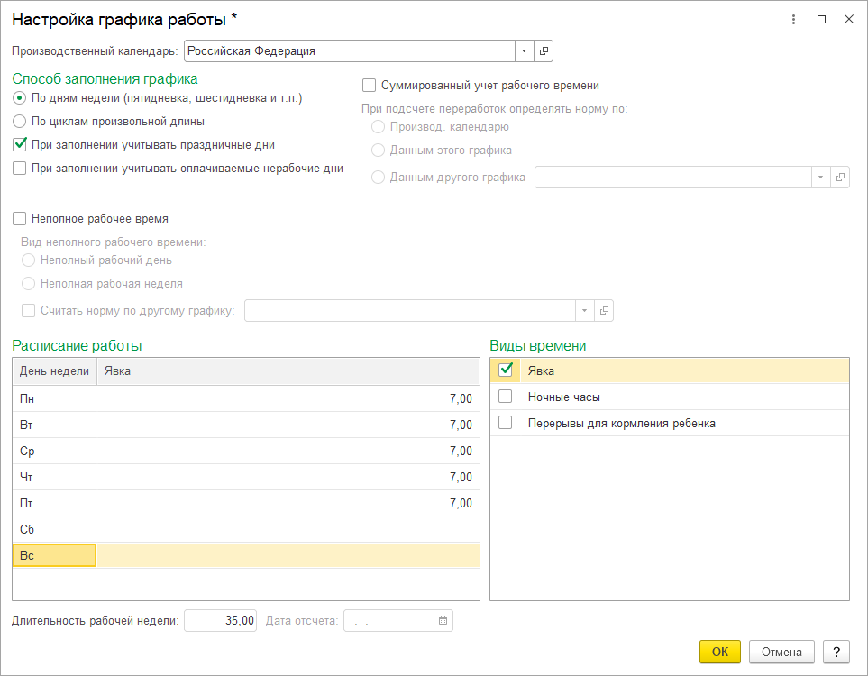 1. Сокращенное рабочее время = 35 ч. в неделю (в нашем учебном примере этот график может использоваться для инвалидов)