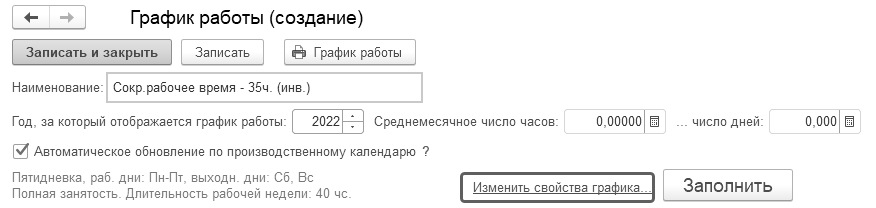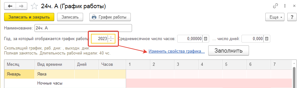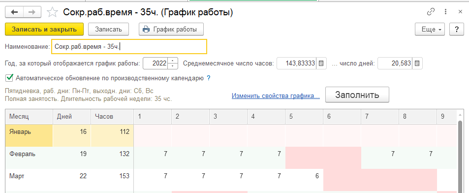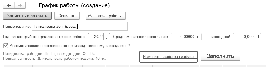 Создадим график "Пятидневка 36ч.": укажем заполнение на 2022г. и перейдем к настройке свойств графика.
