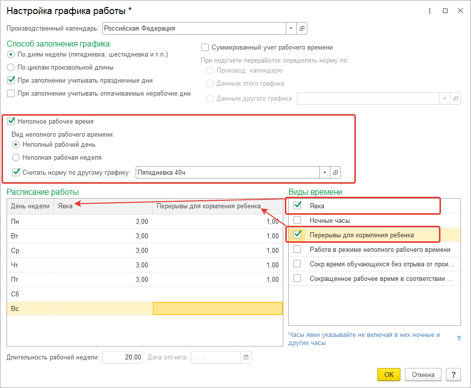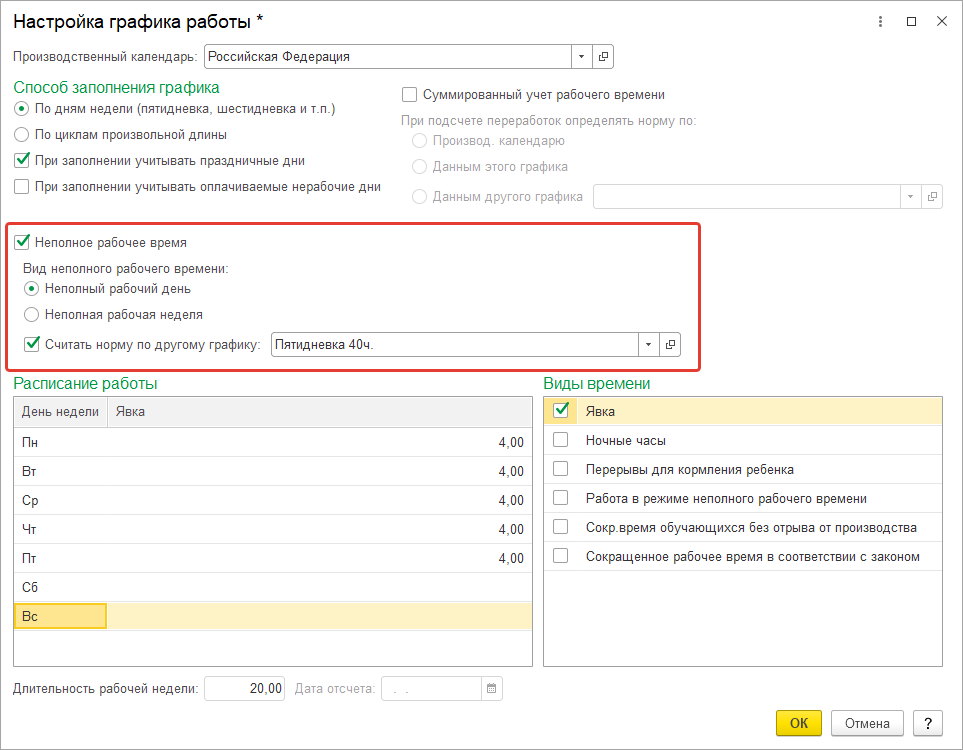 3. Неполное время. Создадим график неполного рабочего времени – 20 часов в неделю. В учебной базе мы будем использовать этот график для совместителей, работающих на 0,5 ставки.