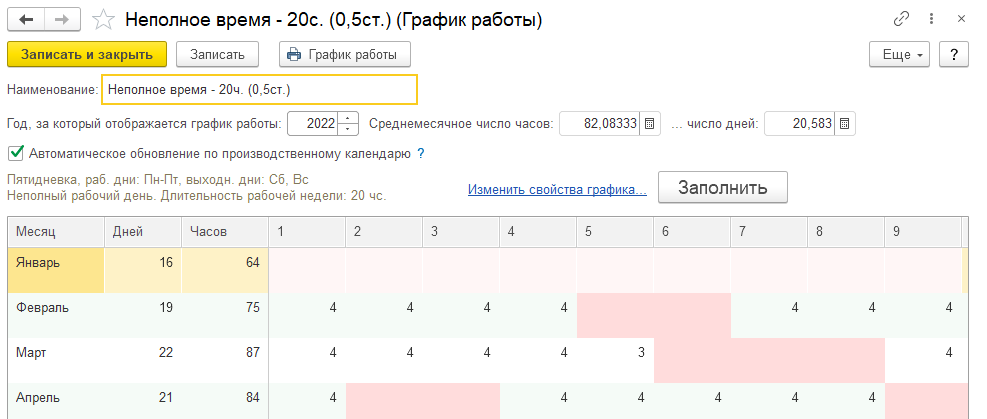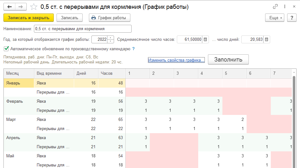 Обратите внимание, что в графиках работы рассчитывается и отображается среднемесячное число дней и число часов, которые используются как показатели при расчете начислений по заработной плате.