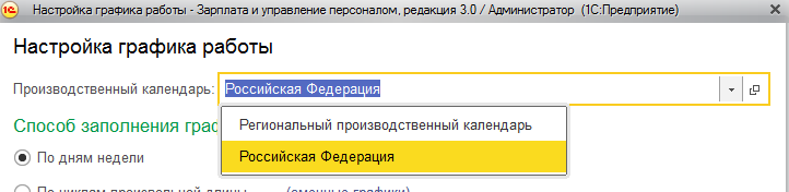 Если в программе используется один производственный календарь, то он автоматически применяется при заполнении графиков. Если же в программе используется несколько производственных календарей, то в свойствах графика необходимо будет выбрать производственный календарь.