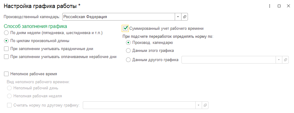 - Также в таких графиках часто используется режим суммированного учета. Если планируется рассчитывать переработки при суммированном учете (и эта настройка предварительно выполнена в настройке расчета зарплаты программы), то для графика необходимо указать, как определять нормы для оценки переработки: по производственному календарю, по текущему графику или по другому графику.