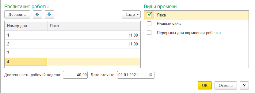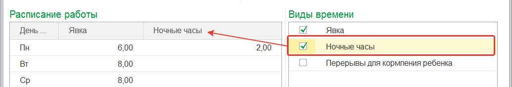 По умолчанию предполагается, что в графике работы будет запланировано явочное время. Однако если в конфигурации в соответствии с настройками расчета зарплаты ведется учет ночных, вечерних часов, используются перерывы для кормления детей или несколько видов планового времени, то возможно отметить флажками несколько видов рабочего времени для графика для составления расписания работы.