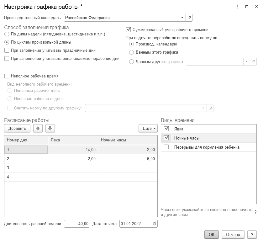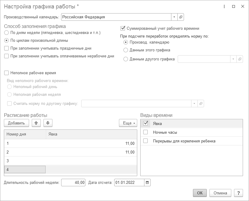 Ведется суммированный учет рабочего времени, организована работа в праздники, смена 11ч., дата отсчета 01.01.2022