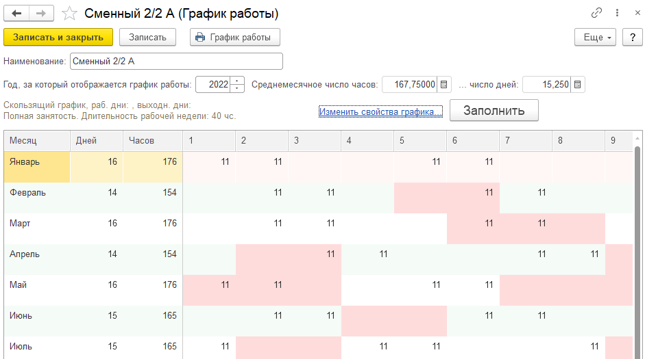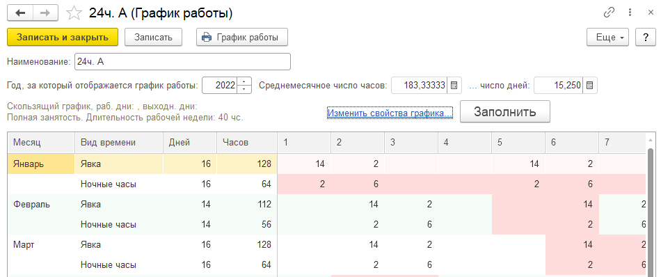 1. Создадим сменный график "Сменный 2/2_А", настроим вручную и заполним его на 2022 год.