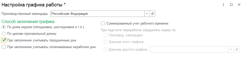 При заполнении учитывать оплачиваемые нерабочие дни. Флажок по умолчанию не установлен. Использовался в 2020г. для применения нерабочих оплачиваемых дней в графике по отдельным указам Президента РФ.
