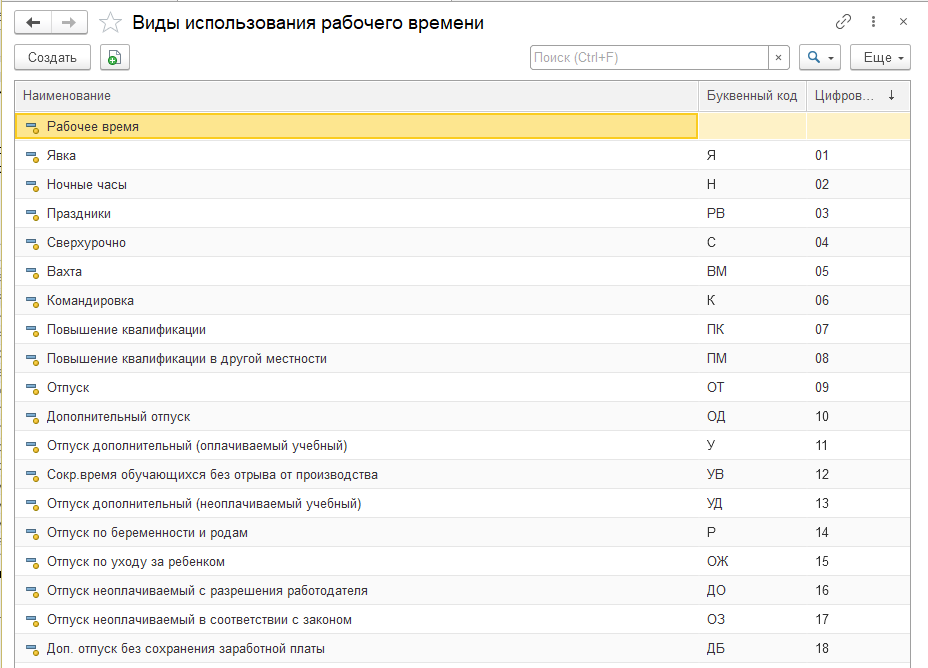 Виды времени, выбираемые в графике работы, заполняются в справочнике "Виды рабочего времени". Справочник доступен в разделе "Настройка" (он относится к классификаторам).