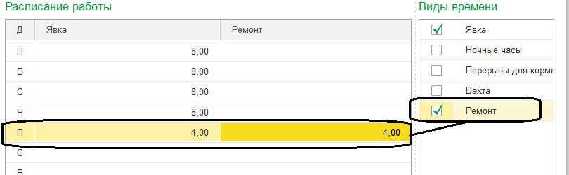 После установки флага "Используется несколько видов времени в графике работы" в настройке расчета зарплаты программы добавленный вид времени доступен при составлении графиков работы.