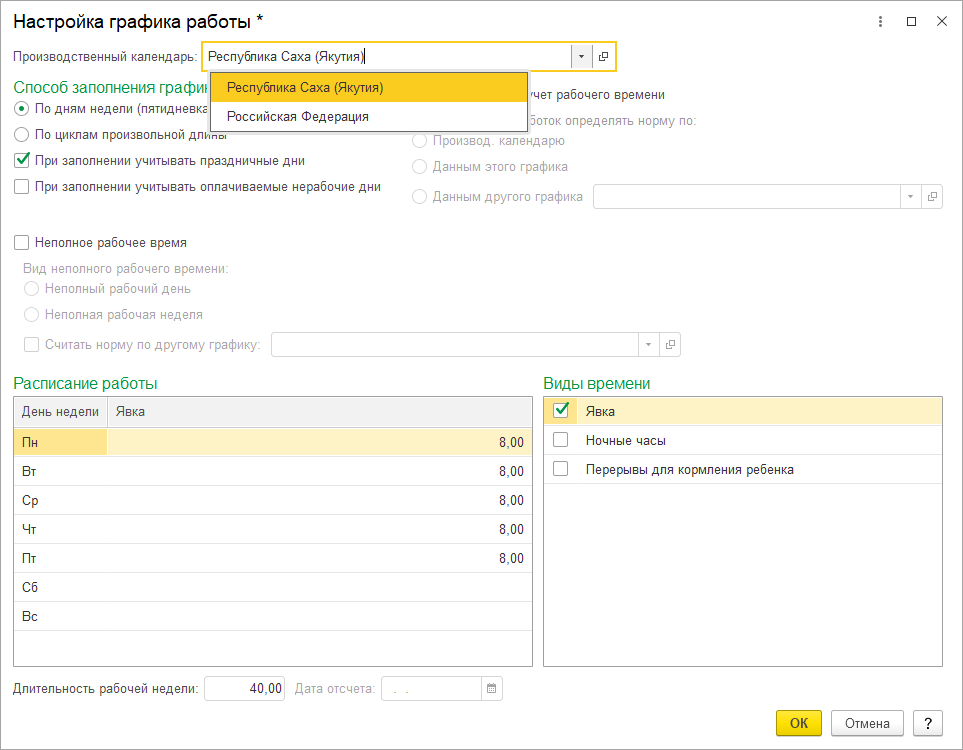 Длительность рабочей недели – это норма по производственному календарю, на который следует ориентироваться, составляя графики суммированного учета. По умолчанию количество часов равно 40, и может быть изменено вручную.