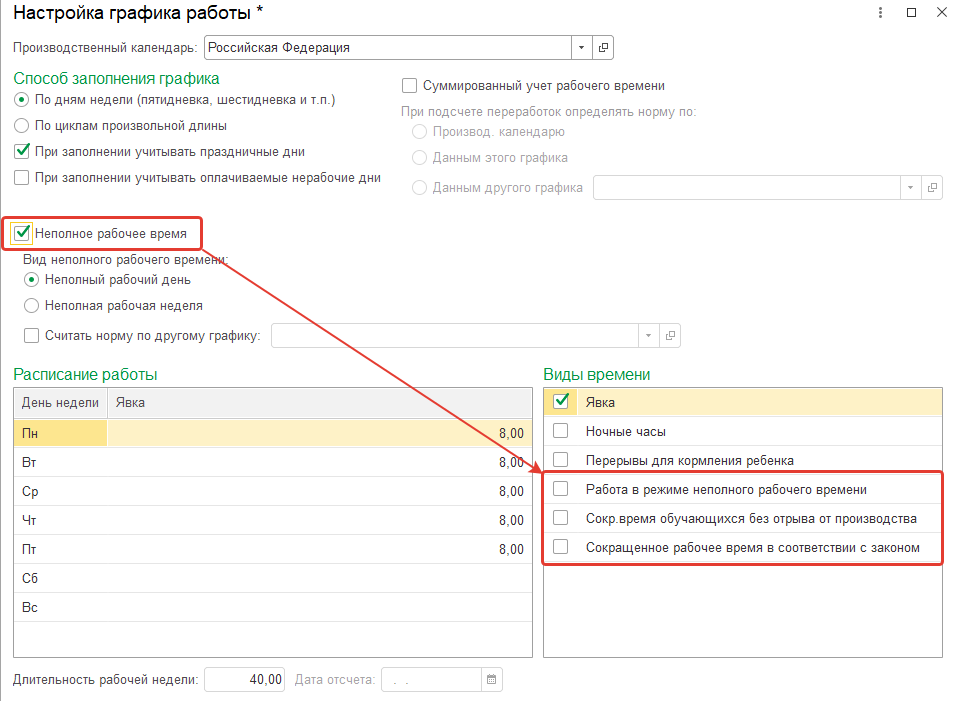 Отличия настроек для сокращенного и неполного времени: